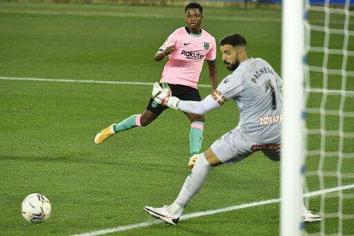 Barcelona's Anssumane Fati shoots the ball during the Spanish La Liga soccer match between Alaves and Barcelona at Mendizorroza stadium in Vitoria, Spain, Saturday, Oct. 31, 2020. (AP Photo/Alvaro Barrientos) The Associated Press