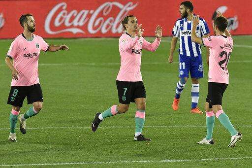 Barcelona's Antoine Griezmann, center, celebrates with teammate Sergi Roberto, right after scoring his side's first goal during the Spanish La Liga soccer match between Alaves and Barcelona at Mendizorroza stadium in Vitoria, Spain, Saturday, Oct. 31, 2020. (AP Photo/Alvaro Barrientos) The Associated Press