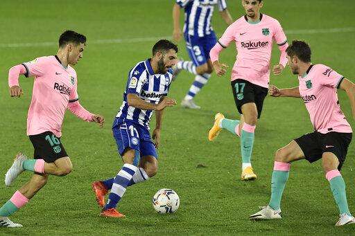 Alaves' Luis Rioja, second left, vies for the ball with Barcelona defenders during the Spanish La Liga soccer match between Alaves and Barcelona at Mendizorroza stadium in Vitoria, Spain, Saturday, Oct. 31, 2020. (AP Photo/Alvaro Barrientos) The Associated Press