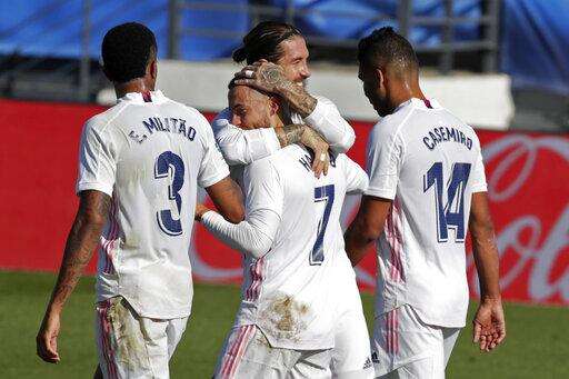 Real Madrid's Eden Hazard, second left, celebrates with teammate Sergio Ramos, second right, after scoring the opening goal during the Spanish La Liga soccer match between Real Madrid and Huesca at Alfredo di Stefano stadium in Madrid, Spain, Saturday, Oct. 31, 2020. (AP Photo/Manu Fernandez) The Associated Press