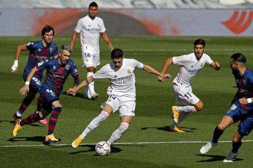 Real Madrid's Federico Valverde, center, plays the ball next to Huesca defenders during the Spanish La Liga soccer match between Real Madrid and Huesca at Alfredo di Stefano stadium in Madrid, Spain, Saturday, Oct. 31, 2020. (AP Photo/Manu Fernandez) The Associated Press