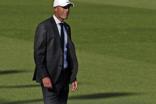 Real Madrid's head coach Zinedine Zidane follows the action during the Spanish La Liga soccer match between Real Madrid and Huesca at Alfredo di Stefano stadium in Madrid, Spain, Saturday, Oct. 31, 2020. (AP Photo/Manu Fernandez) The Associated Press