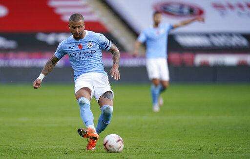 Manchester City's Kyle Walker kicks the ball during the English Premier League soccer match between Sheffield United and Manchester City at Bramall Lane stadium in Sheffield, England, Saturday, Oct. 31, 2020. (Tim Keeton/Pool via AP) The Associated Press