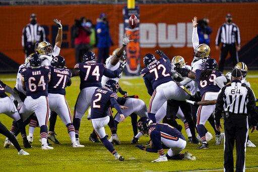 Chicago Bears kicker Cairo Santos (2) kicks a field goal to tie the game with the New Orleans Saints in the closing seconds of the second half of an NFL football game in Chicago, Sunday, Nov. 1, 2020. (AP Photo/Charles Rex Arbogast) The Associated Press