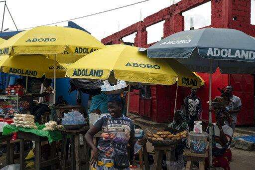 Street vendors use parasols reading "Abobo ADOland" in reference to the Ivory Coast President Alassane Ouattara, who is known as ADO, at Abobo neighborhood in Abidjan, Ivory Coast, Monday, Nov. 2, 2020. International election observers in Ivory Coast said Monday that voter turnout was "extremely low" in parts of the country after leading opposition candidates called for a boycott to protest President Alassane Ouattara's bid for a controversial third term. (AP Photo/Leo Correa)