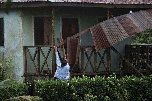 A woman works to recover the part of roof damaged by Hurricane Eta in Wawa, Nicaragua, Tuesday, Nov. 3, 2020. Eta slammed into Nicaragua's Caribbean coast with potentially devastating winds Tuesday, while heavy rains thrown off by the Category 4 storm already were causing rivers to overflow across Central America. (AP Photo/Carlos Herrera)