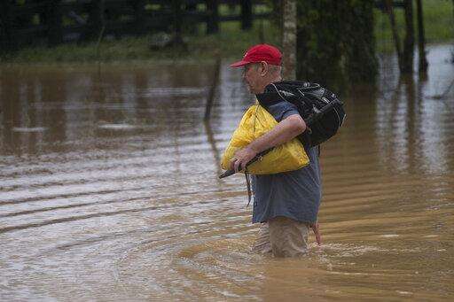 Angel Zavala, 72, carries a few belongings he was able to salvage from his home in a flooded neighborhood of Jehova, Honduras, Wednesday, Nov. 4, 2020. Eta weakened from the Category 4 hurricane to a tropical storm after lashing the Caribbean coast for much of Tuesday, its floodwaters isolating already remote communities and setting off deadly landslides. (AP Photo/Delmer Martinez)