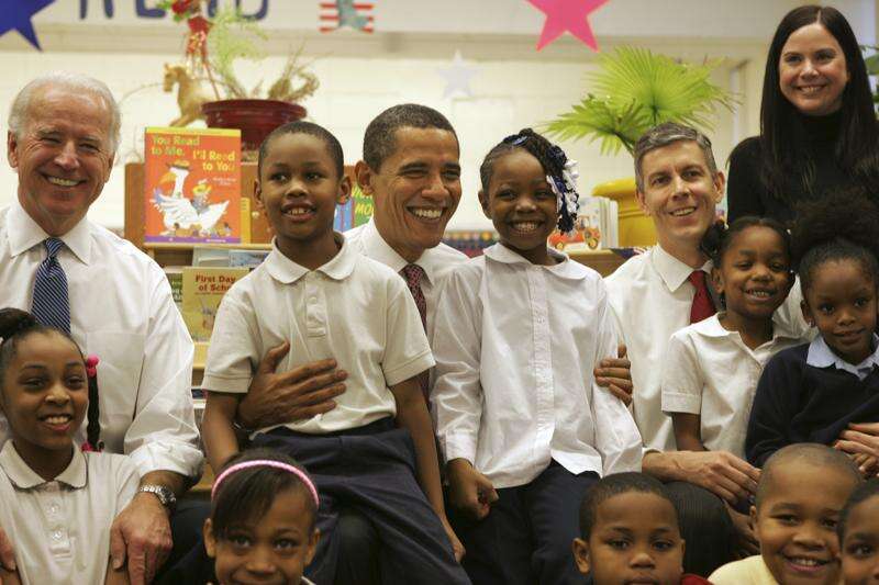President-elect Barack Obama, center, Vice President-elect Joe Biden, left, and Education Secretary-designate Arne Duncan, second from right, pose with students at the Dodge Renaissance Academy in Chicago, Tuesday, Dec. 16, 2008.