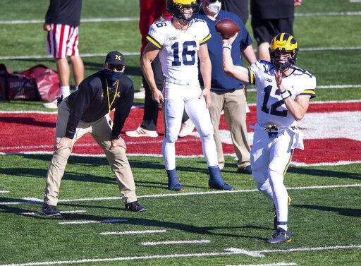 Michigan head coach Jim Harbaugh, left, watches as quarterback Cade McNamara (12) warms up before an NCAA college football game against Indiana, Saturday, Nov. 7, 2020, in Bloomington, Ind. (AP Photo/Doug McSchooler) The Associated Press