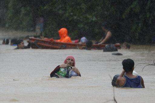 Residents negotiate a flooded road as floods continue to rise in Marikina, Philippines due to Typhoon Vamco on Thursday, Nov. 12, 2020. The typhoon swelled rivers and flooded low-lying areas as it passed over the storm-battered northeast Philippines, where rescuers were deployed early Thursday to help people flee the rising waters. (AP Photo/Aaron Favila) The Associated Press