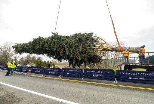 This year's Rockefeller Center Christmas tree, a 75-foot tall, 11-ton Norway Spruce, is craned onto a flatbed truck, Thursday, Nov. 12, 2020, in Oneonta, N.Y. The tree will be brought into New York City and erected at Rockefeller Center on Saturday, Nov. 14. (Diane Bondareff/AP Images for Tishman Speyer) The Associated Press