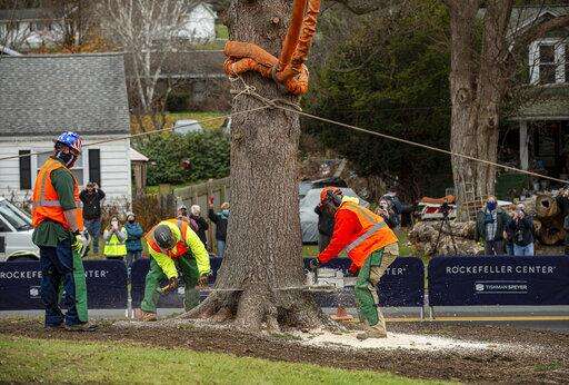 Workers cut down a 75-foot tall, 11-ton Norway Spruce that will serve as this year's Rockefeller Center Christmas tree, Thursday, Nov. 12, 2020, in Oneonta, N.Y. The tree will be brought into New York City by flatbed truck and erected at Rockefeller Center on Saturday, Nov. 14. (Diane Bondareff/AP Images for Tishman Speyer) The Associated Press