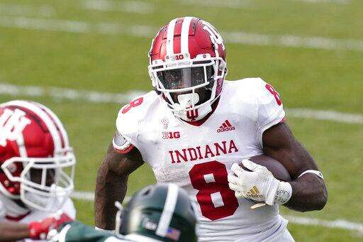 Indiana running back Stevie Scott III rushes during the second half of an NCAA college football game against Michigan State, Saturday, Nov. 14, 2020, in East Lansing, Mich. (AP Photo/Carlos Osorio)