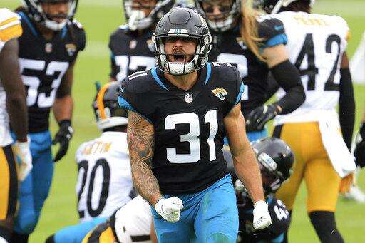 Jacksonville Jaguars running back Nathan Cottrell (31) reacts after making a tackle against the Pittsburgh Steelers during the first half of an NFL football game, Sunday, Nov. 22, 2020, in Jacksonville, Fla. (AP Photo/Matt Stamey) The Associated Press