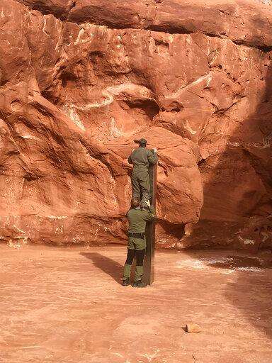 They found the three-sided stainless-steel object is about as tall as two men put together. But they discovered no clues about who might have driven it into the ground among the undulating red rocks or why.