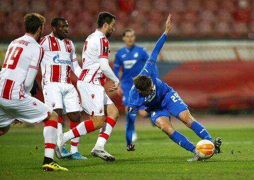 Hoffenheim's Robert Skov, right, kicks the ball during the Europa League group L soccer match between Red Star and Hoffenheim at the Rajko Mitic Stadium in Belgrade, Serbia, Thursday, Dec. 3, 2020. (AP Photo/Marko Drobnjakovic)