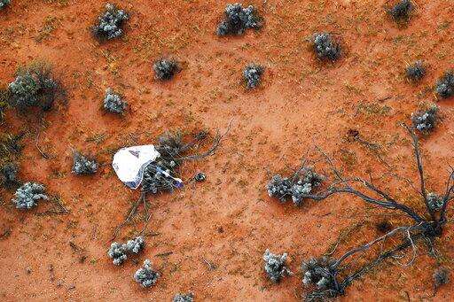 This photo provided by Japan Aerospace Exploration Agency (JAXA) shows the Japanese space capsule, center, which is about to re-enter Earth with asteroid samples as it is seen in Coober Pedy, southern Australia, on Sunday, Dec. 6, 2020. Japanese space officials said Sunday they are excited about bringing home a capsule that safely landed in Australian Outback while carrying soil samples from a distant asteroid so they can start analyzing what they say are treasures inside. (JAXA via AP)