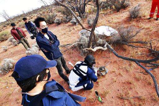 In this photo provided by the Japan Aerospace Exploration Agency (JAXA), members of JAXA retrieve a capsule dropped by Hayabusa2 in Woomera, southern Australia, Sunday, Dec. 6, 2020. A Japanese capsule carrying the first samples of asteroid subsurface shot across the night atmosphere early Sunday before successfully landing in the remote Australian Outback, completing a mission to provide clues to the origin of the solar system and life on Earth. (JAXA via AP)
