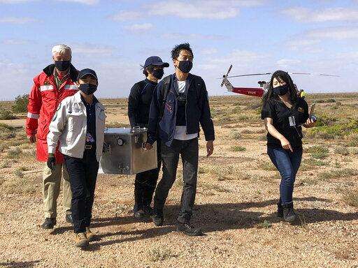 In this photo provided by the Australian Space Agency, members of the Japan Aerospace Exploration Agency (JAXA) arrive at a range support facility in Woomera, Australia, Sunday, Dec. 6, 2020, carrying a box containing asteroid samples that they retrieved on a remote area in southern Australia. JAXA said Hayabusa2 released the small capsule of samples Saturday. JAXA officials said they hoped to conduct a preliminary safety inspection at an Australian lab and bring the capsule back to Japan soon. (Australian Space Agency via AP)