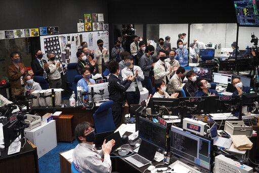 In this photo provided by the Japan Aerospace Exploration Agency (JAXA), Hayabusa2 project members react as they watch over the live streaming about the fireball phase of the re-entry capsule at a control room of JAXA's Sagamihara Campus in Sagamihara, near Tokyo, early Sunday, Dec. 6, 2020. A Japanese capsule carrying the first samples of asteroid subsurface shot across the night atmosphere early Sunday before successfully landing in the remote Australian Outback, completing a mission to provide clues to the origin of the solar system and life on Earth. (JAXA via AP)