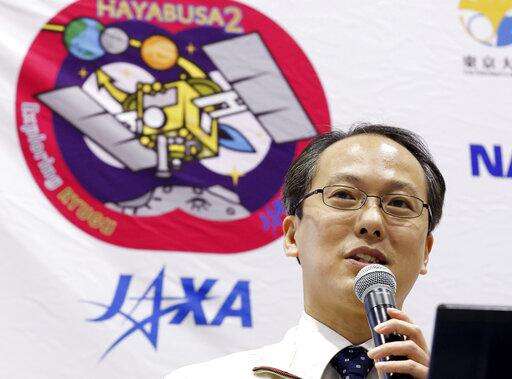 Yuichi Tsuda, Hayabusa2 project manager at Japan Aerospace Exploration Agency, speaks during a press conference at JAXA's Sagamihara Campus in Sagamihara, near Tokyo Sunday, Dec. 6, 2020. Japanese space officials said Sunday they are excited about bringing home a capsule carrying soil samples from a distant asteroid and safely landed on Australian Outback and look inside and analyzing what's inside. (Masanori Takei/Kyodo News via AP)