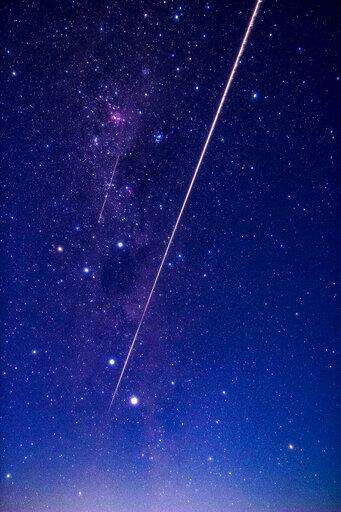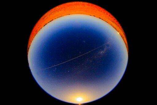 This photo provided by Japan Aerospace Exploration Agency (JAXA) shows the Japanese space capsule about to re-enter Earth with asteroid samples seen in Coober Pedy, southern Australia, on Sunday, Dec. 6, 2020. A Japanese capsule carrying the first samples of asteroid subsurface shot across the night atmosphere early Sunday before successfully landing in the remote Australian Outback, completing a mission to provide clues to the origin of the solar system and life on Earth. (JAXA via AP)