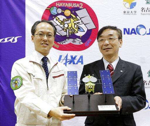 Yuichi Tsuda, left, Hayabusa2 project manager of Japan Aerospace Exploration Agency (JAXA), and Hitoshi Kuninaka, Director General of ISAS/JAXA, pose with a Hayabusa2 model, during a press conference at JAXA's Sagamihara Campus in Sagamihara, near Tokyo Sunday, Dec. 6, 2020. Japanese space officials said Sunday they are excited about bringing home a capsule that safely landed on Australian Outback while carrying soil samples from a distant asteroid, and look inside and start analyzing what they call treasures inside.(Masanori Takei/Kyodo News via AP)