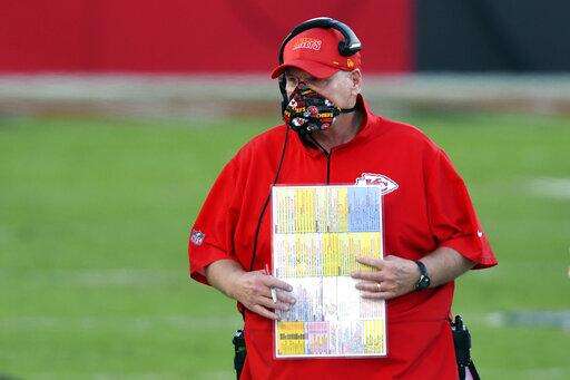 Kansas City Chiefs head coach Andy Reid wears a protective face mask during the first half of an NFL football game against the Tampa Bay Buccaneers Sunday, Nov. 29, 2020, in Tampa, Fla. (AP Photo/Jason Behnken) The Associated Press
