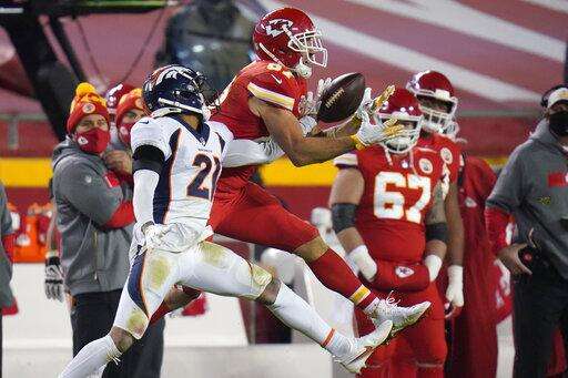 Denver Broncos cornerback A.J. Bouye (21) breaks up a pass intended for Kansas City Chiefs tight end Travis Kelce (87) in the second half of an NFL football game in Kansas City, Mo., Sunday, Dec. 6, 2020. (AP Photo/Jeff Roberson) The Associated Press