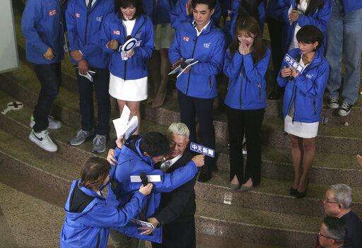 An employee hugs Tsai Eng-meng, owner of CTi TV, on the last night before the cable news channel halts its broadcast operations at the hall of CTi TV in Taipei, Taiwan, Friday, Dec. 11, 2020. CTi TV, a leading pro-China cable news channel, halted its broadcast operations at midnight Friday after Taiwan''s government refused to renew its license, citing accuracy issues. (AP Photo/Chiang Ying-ying) The Associated Press