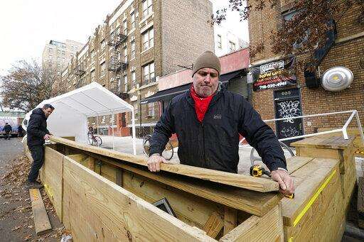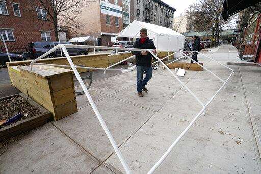 Wade Hagenbart, right, lifts the top off a wooden support barrier for a tent he's constructing for outdoor dining Guero's, the tiny but popular taco and margarita restaurant he co-owns in the Prospect Heights neighborhood of Brooklyn, Wednesday, Dec. 2, 2020, in New York. (AP Photo/Kathy Willens) The Associated Press