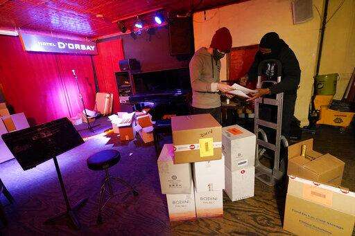 Bartender Alex Wright, left, reviews paperwork on a wine delivery at Barbès, a popular music venue and bar that has been converted to a bottle shop to survive the winter during the coronavirus pandemic, Tuesday, Dec. 1, 2020, in New York. (AP Photo/Kathy Willens) The Associated Press