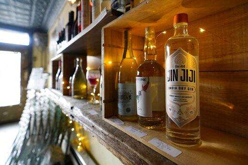 Bottles of organic and biodynamically-produced wine, whiskey and liquor line the shelves at Barbès, a popular neighborhood music venue and bar which was converted into a bottle shop to survive the winter during the coronavirus pandemic, Tuesday, Dec. 1, 2020, in the Brooklyn borough of New York. (AP Photo/Kathy Willens) The Associated Press