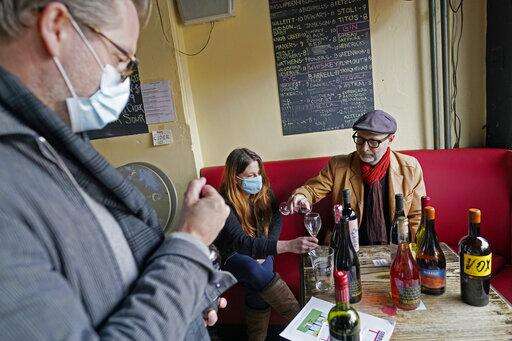 Wine salesman Jeff Hansen, left, replaces the cork on a bottle of wine after pouring samples for Barbès retail manager Hanna Cheek, center, and owner Olivier Conan at the popular music venue and bar Conan converted to a bottle shop during the coronavirus pandemic Tuesday, Dec. 1, 2020, in the Brooklyn borough of New York. (AP Photo/Kathy Willens) The Associated Press