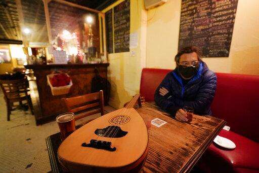 Customer Koray Calistan, has a drink at Barbès, a popular neighborhood music venue and bar converted to a bottle shop to survive the winter during the coronavirus pandemic, Tuesday, Dec. 1, 2020, in New York. (AP Photo/Kathy Willens) The Associated Press