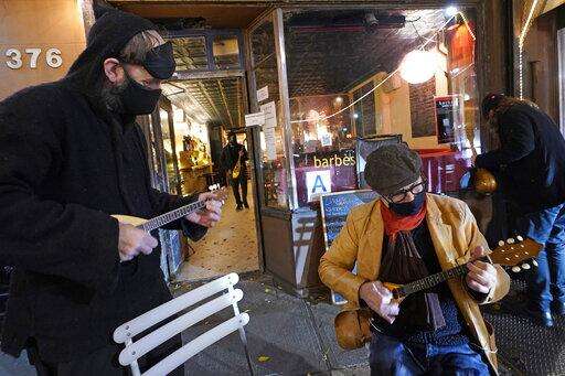 A band member, left, joins Olivier Conan, center, as the pair strum baglamas, stringed instruments from Greece and Turkey similar to lutes, outside the entrance to Barbès, a popular neighborhood music venue and bar that Conan recently converted to a bottle shop, Tuesday, Dec. 1, 2020, in the Brooklyn borough of New York. (AP Photo/Kathy Willens) The Associated Press
