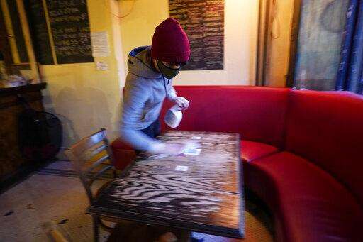 Bartender Alex Wright sanitizes a table before opening Barbès, a popular neighborhood music venue and bar converted to a bottle shop and mostly-outdoor bar during the the coronavirus pandemic, Tuesday, Dec. 1, 2020, in New York. (AP Photo/Kathy Willens) The Associated Press