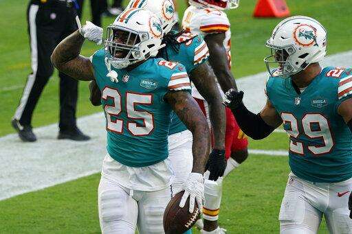 Miami Dolphins cornerback Xavien Howard (25) celebrates after intercepting a pass during the second half of an NFL football game against the Kansas City Chiefs, Sunday, Dec. 13, 2020, in Miami Gardens, Fla. (AP Photo/Lynne Sladky) The Associated Press