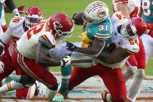 Kansas City Chiefs defensive tackle Mike Pennel (64) and defensive end Tanoh Kpassagnon (92) tackle Miami Dolphins running back DeAndre Washington (31), during the second half of an NFL football game, Sunday, Dec. 13, 2020, in Miami Gardens, Fla. (AP Photo/Wilfredo Lee) The Associated Press