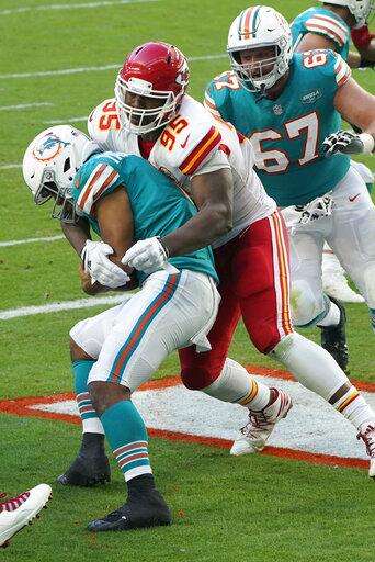 Kansas City Chiefs defensive tackle Chris Jones (95) sacks Miami Dolphins quarterback Tua Tagovailoa (1) in the endzone for a safety, during the second half of an NFL football game, Sunday, Dec. 13, 2020, in Miami Gardens, Fla. (AP Photo/Wilfredo Lee) The Associated Press