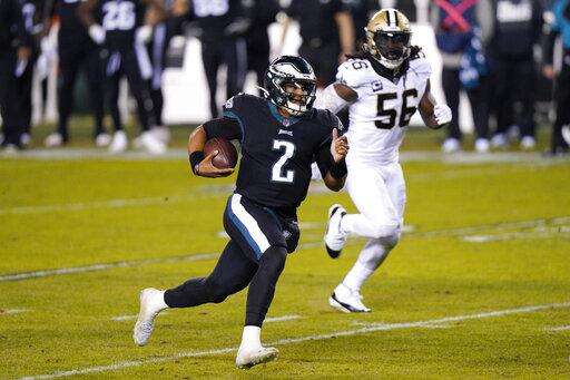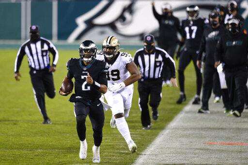The rookie ran for 106 yards and threw for 167 and one touchdown as Philadelphia defeated the Saints 24-21, snapping New Orleans' nine-game winning streak and ending Philly's four-game slide.