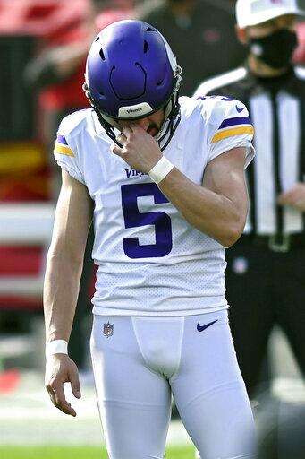 Minnesota Vikings' Dan Bailey (5) reacts after missing a field goal against the Tampa Bay Buccaneers during the first half of an NFL football game Sunday, Dec. 13, 2020, in Tampa, Fla. (AP Photo/Jason Behnken) The Associated Press