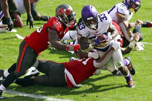 Minnesota Vikings running back Dalvin Cook (33) eludes a tackle by Tampa Bay Buccaneers inside linebacker Devin White (45) to score during the first half of an NFL football game Sunday, Dec. 13, 2020, in Tampa, Fla. (AP Photo/Mark LoMoglio) The Associated Press