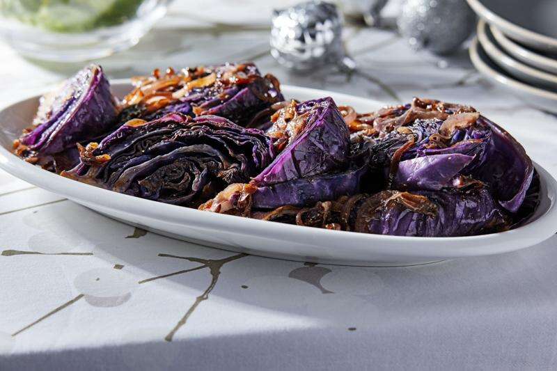 Cover the pan and place in the oven. Braise for 1 hour, or until the cabbage is tender (a sharp knife should slide in easily).