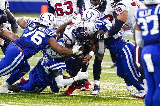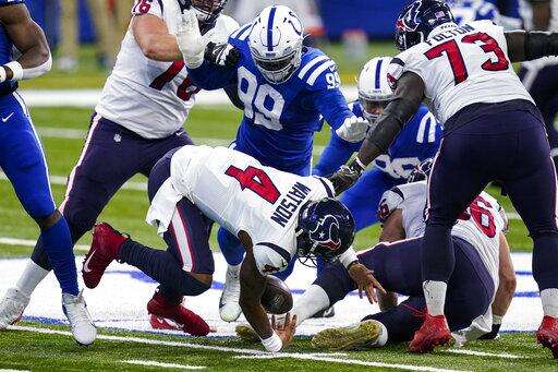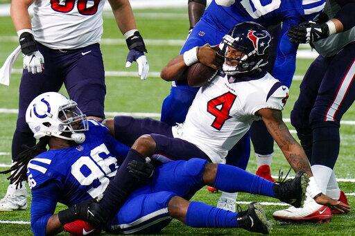 Houston Texans quarterback Deshaun Watson (4) is sacked by Indianapolis Colts defensive tackle Taylor Stallworth (76) and defensive end Justin Houston (50) in the first half of an NFL football game in Indianapolis, Sunday, Dec. 20, 2020. (AP Photo/Darron Cummings) The Associated Press