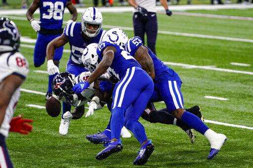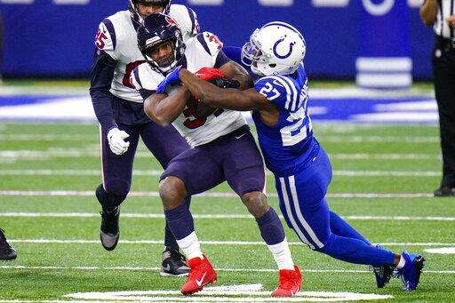 Houston Texans running back David Johnson (31) is tackled by Indianapolis Colts cornerback Xavier Rhodes (27) in the first half of an NFL football game in Indianapolis, Sunday, Dec. 20, 2020. (AP Photo/AJ Mast) The Associated Press