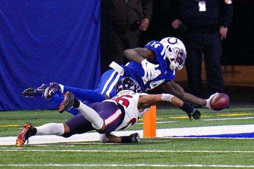 Indianapolis Colts wide receiver Zach Pascal (14) goes over Houston Texans cornerback Vernon Hargreaves III (26) for a touchdown in the second half of an NFL football game in Indianapolis, Sunday, Dec. 20, 2020. (AP Photo/AJ Mast) The Associated Press