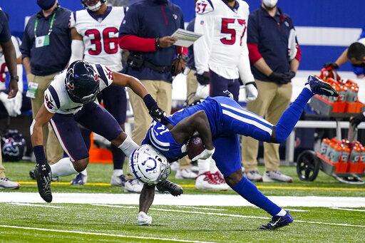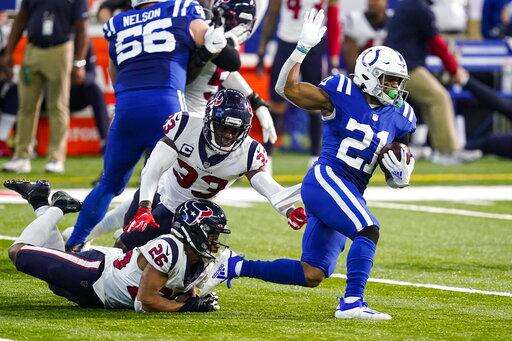 Indianapolis Colts running back Nyheim Hines (21) gets past Houston Texans safety A.J. Moore (33) and cornerback Vernon Hargreaves III (26) in the second half of an NFL football game in Indianapolis, Sunday, Dec. 20, 2020. (AP Photo/Darron Cummings) The Associated Press