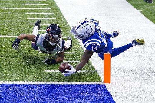 Indianapolis Colts wide receiver Zach Pascal (14) goes over Houston Texans cornerback Vernon Hargreaves III (26) for a touchdown in the second half of an NFL football game in Indianapolis, Sunday, Dec. 20, 2020. (AP Photo/Darron Cummings) The Associated Press