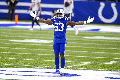 Indianapolis Colts outside linebacker Darius Leonard (53) celebrates after the defense recovered a fumble by the Houston Texans in the final minute of the second half of an NFL football game in Indianapolis, Sunday, Dec. 20, 2020. (AP Photo/Darron Cummings) The Associated Press